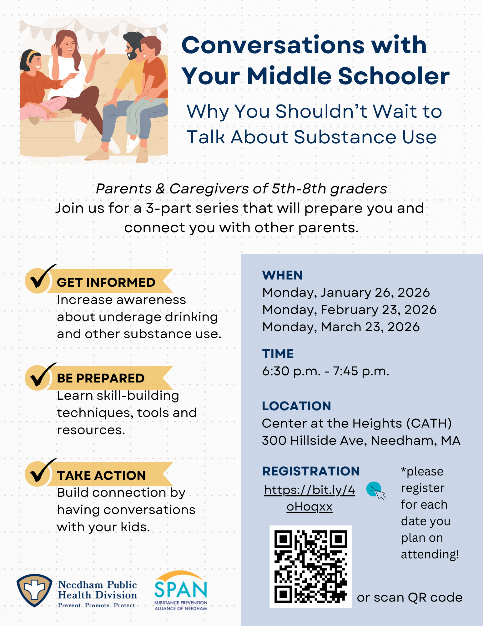 Conversations with Your Middle Schooler Nov 13 Written By Karen Shannon Parents & Caregivers of 5th-8th graders! Join us for a 3-part series that will prepare you and connect you with other parents. Make sure to register for each session individually! https://SPANConvos.eventbrite.com Karen Shannon